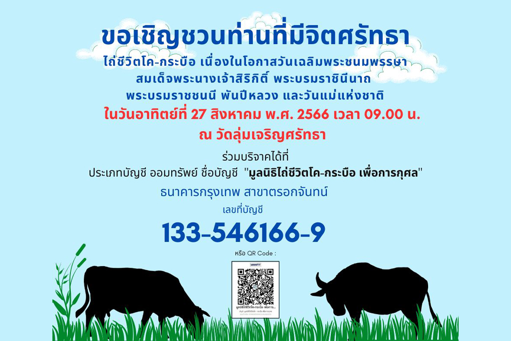 มูลนิธิไถ่ชีวิตโค-กระบือ เพื่อการกุศล ขอเชิญผู้มีจิตศรัทธาร่วมบริจาคไถ่ชีวิตโค-กระบือ เนื่องในโอกาสวันเฉลิมพระชนมพรรษา สมเด็จพระนางเจ้าสิริกิติ์ พระบรมราชินีนาถ พระบรมราชชนนี พันปีหลวง และวันแม่แห่งชาติ พ.ศ. 2566 ในวันที่ 27 สิงหาคม พ.ศ. 2566 เวลา 09.00 น. โดยนำไปมอบให้กับเกษตรกรที่มีฐานะยากจนต่อไป 1. โค ตัวละ 25,000.00 บาท 2. กระบือ ตัวละ 28,000.00 บาท 3. ตามกำลังศรัทธา ร่วมบริจาคได้ที่ ธนาคารกรุงเทพ สาขาตรอกจันทน์ บัญชี ออมทรัพย์ ชื่อบัญชี “มูลนิธิไถ่ชีวิตโค-กระบือ เพื่อการกุศล” เลขที่บัญชี 133-546166-9 ติดต่อสอบถาม โทรศัพท์ : 091-727-1549, 02-212-5331 Line ID : @cowsafe website : www.savebuff.org facebook …